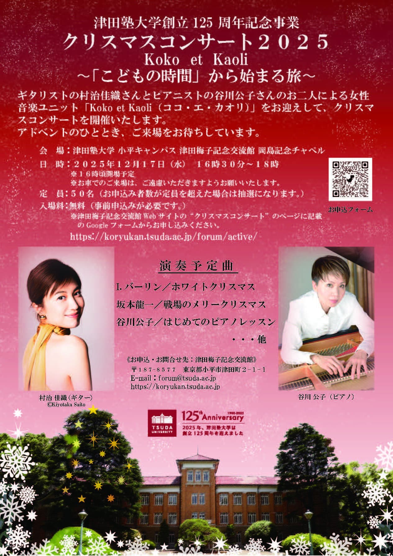 ピアニストの谷川公子とギタリストの村治佳織さんの二人によるユニット「Koko et Kaoli(ココ・エ・カオリ)」が出演する、クリスマスコンサートです。 アドベントのひととき、ご来場をお待ちしています。