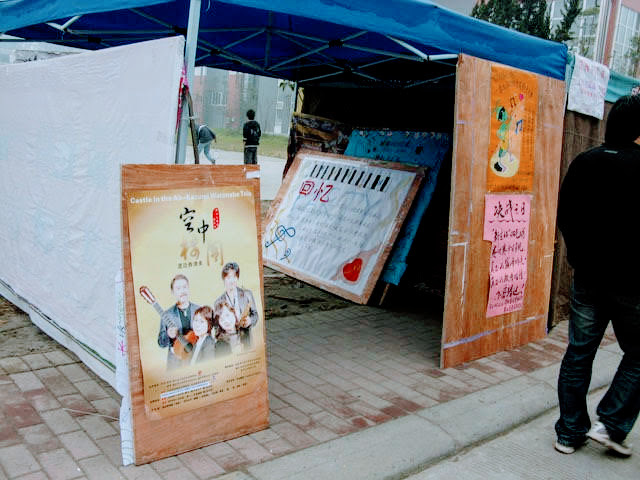 翌日は三国志ゆかりの地である成都へと移動。四川省人民対外友好協会より熱烈歓迎を受け、一同、恐縮。中国では敬称に『~先生』が使われるが日本語でのいわゆる『先生』とは別もの。が、通訳嬢に『先生』を連発されるとなんとも居心地の悪い感覚にもぞもぞしてしまう。成都での公演前日に、2008年の四川大地震で被災し、母校が崩壊した学生たちが分散して寄宿しながら勉強や創作をしている「アバ師範専科学校」に慰問演奏を行った。二時間余りのバス移動の末に現地到着。ここでもやはり熱烈歓迎。さらに対岸に座る人の顔もよく見えないほどの直径の円卓を囲む大昼食会。暖房もままならぬ冷え冷えとした会場での演奏の後、我々への返礼として、自分が生まれた地方の民族衣装をまとった学生達が、歌や踊りを披露してくれる。寒さに無頓着な薄着にも驚いたが、なにより彼らの屈託のない笑顔と、被災を乗り越えた逞しさには、おもわず胸が熱くなった。